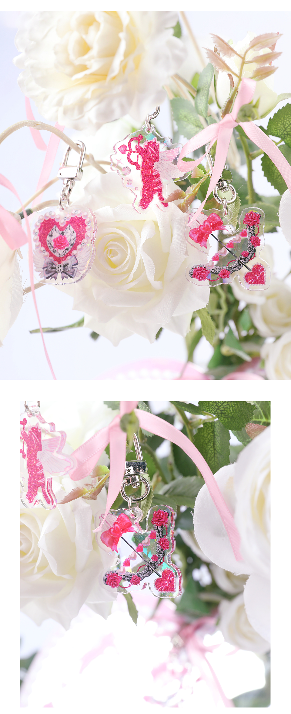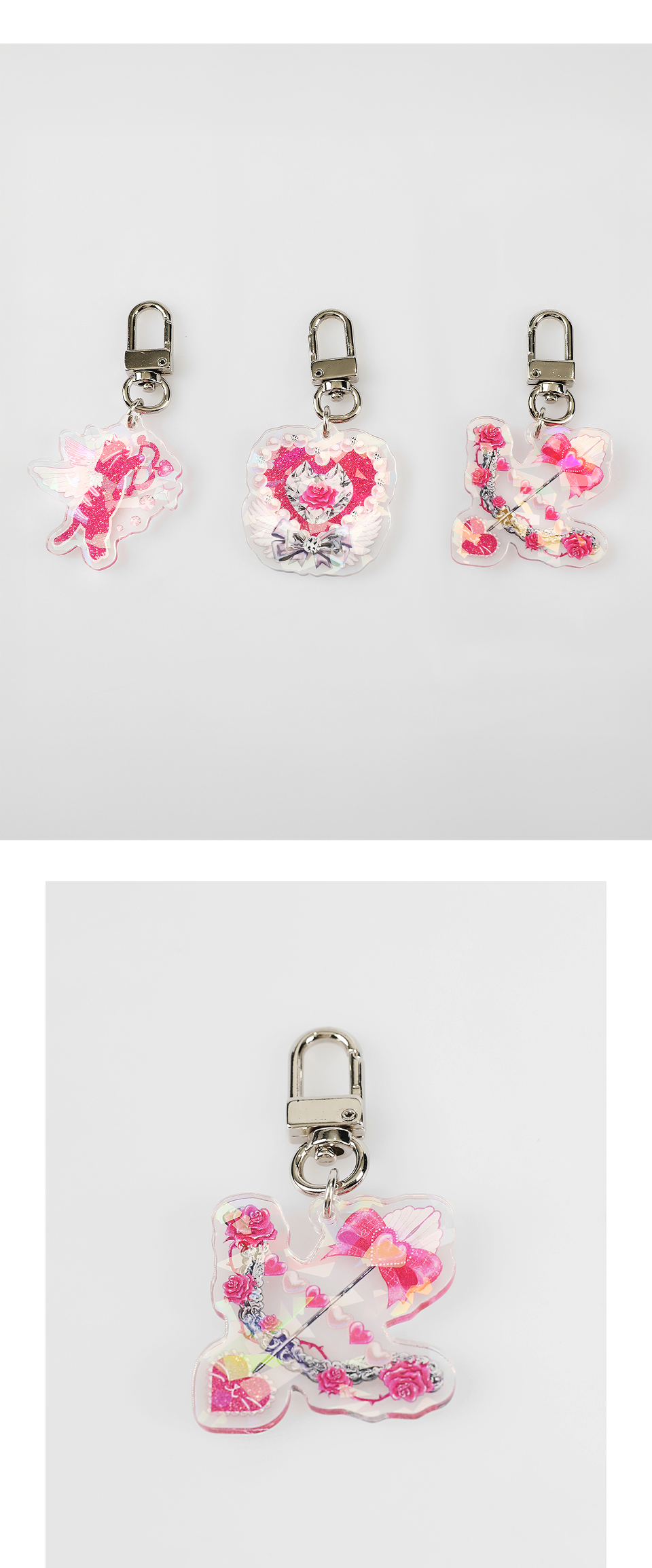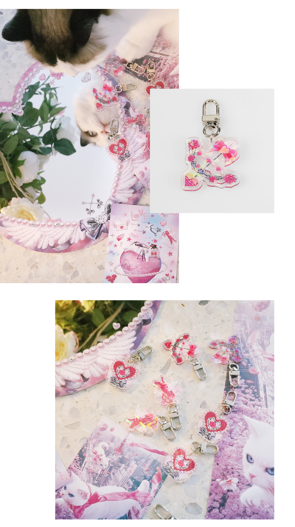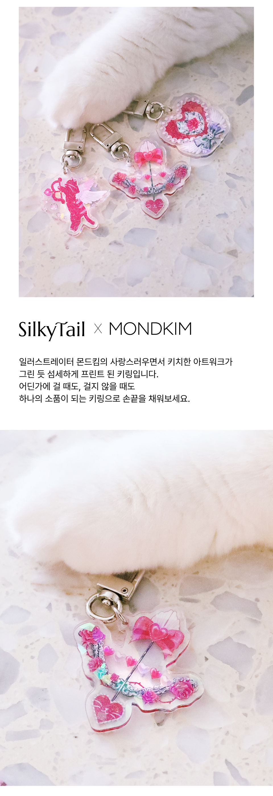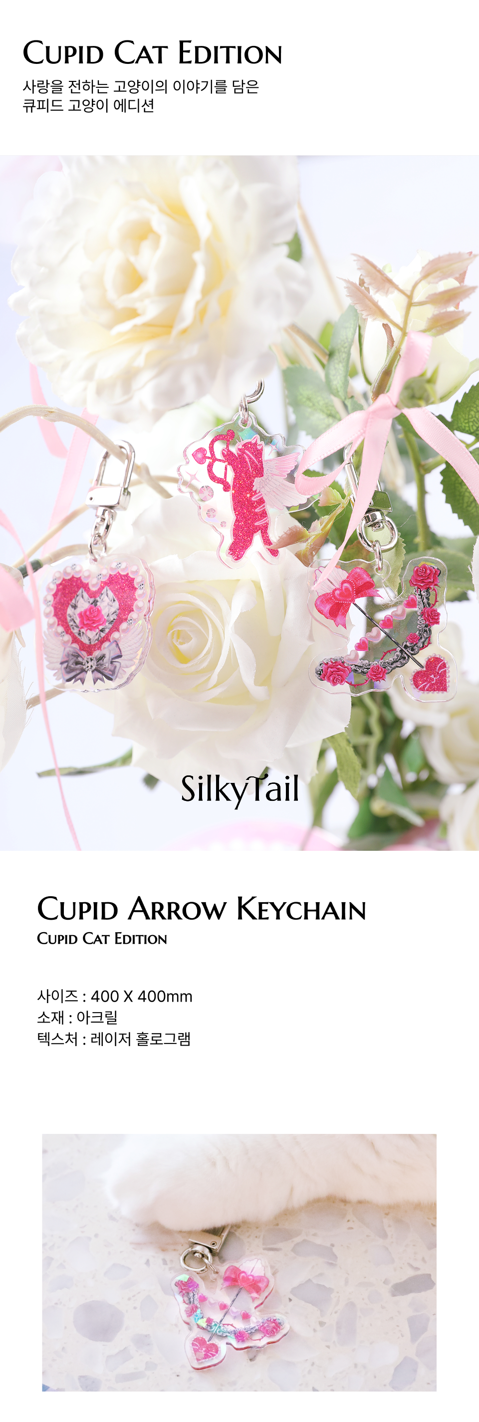 핑크색을 좋아하는 큐피드 고양이는 화살도 남달라요. 리본과 장미. 보석으로 장식된 반짝이는 화살은 어디를 향할까요? 반짝이는 사랑을 담은 홀로그램 키링.